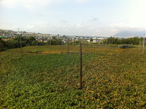 今朝、家の2階から撮った写真です。収穫が終わった畑は、葉っぱの色が黄色く変わって来ました。ぶどうの収穫終了時期が例年よりも今年は少し早いですね。