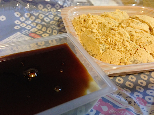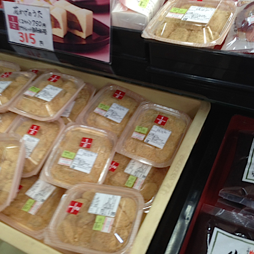 すいません、写真ボケちゃいましたが信玄餅の切り落とし(100円)を購入