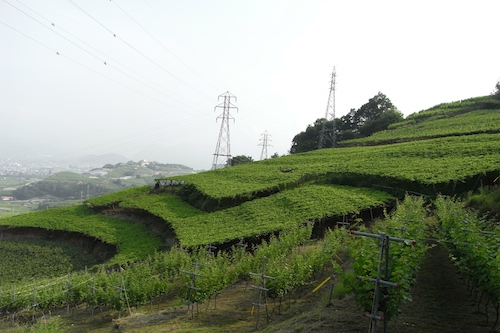 ウチのデラウェアの畑の横にある、東夢ワイナリーさんの畑で採れたピノノワールとメルローのワイン。
